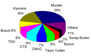 LTCC技術(shù)最早由美國開始發(fā)展,初期應(yīng)用于軍用產(chǎn)品,后來歐洲廠商將其引入車用市場,而后再由日本廠商將其應(yīng)用于資訊產(chǎn)品中。目前,LTCC材料在日本、美國等發(fā)達國家已進入產(chǎn)業(yè)化、系列化和可進行材料設(shè)計的階段。在全球LTCC市場占有率九大廠商之中,日商有Murata,Kyocera,TDK和Taiyo Yuden;美商有CTS,歐洲商有Bosch, CMAC,Epcos及Sorep-Erulec等。國外廠商由于投入已久,在產(chǎn)品質(zhì)量,專利技術(shù)、材料掌控及規(guī)格主導(dǎo)權(quán)等均占有領(lǐng)先優(yōu)勢。圖1給出全球LTCC廠商市場占有情況。而國內(nèi)LTCC產(chǎn)品的開發(fā)比國外發(fā)達國家至少落后五年,擁有自主知識產(chǎn)權(quán)的材料體系和器件幾乎是空白。國內(nèi)目前LTCC陶瓷材料基本有兩個來源:一是購買國外陶瓷生帶;二是LTCC生產(chǎn)廠從陶瓷材料到生帶自己開發(fā)。隨著未來LTCC制品市場中運用LTCC制作的組件數(shù)目逐漸被LTCC模塊與基板所取代,終端產(chǎn)品產(chǎn)能過剩,價格和成本競爭日趨激烈,元器件的國產(chǎn)化必將提上議事日程,這為國內(nèi)LTCC產(chǎn)品的發(fā)展提供了良好的市場契機。中國在LTCC市場占據(jù)一定份額的是疊層式電感器和電容器生磁帶。目前,清華大學(xué)材料系、上海硅酸鹽研究所等單位正在實驗室開發(fā)LTCC用陶瓷粉料,但還尚未到批量生產(chǎn)的程度。南玻電子公司正在用進口粉料,開發(fā)出介電常數(shù)為9.1、18.0和37.4的三種生帶,厚度從10µm到100µm,生帶厚度系列化,為不同設(shè)計、不同工作頻率的LTCC產(chǎn)品的開發(fā)奠定了基礎(chǔ)。國內(nèi)現(xiàn)在急需開發(fā)出系列化的、擁有自主知識產(chǎn)權(quán)的LTCC 瓷粉料,并專業(yè)化生產(chǎn)LTCC用陶瓷生帶系列,為LTCC產(chǎn)業(yè)的開發(fā)奠定基礎(chǔ)。
