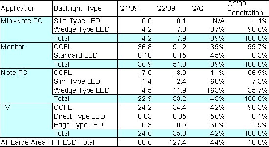從應(yīng)用別來看有1千430萬片用在筆記本電腦上,790萬片用在上網(wǎng)本上,60萬片用在電視上,而有10萬片用在桌上型顯示器上。由以下表一顯示2009年第二季 LED背光源面板在各種不同的應(yīng)用中的滲透率,上網(wǎng)本全數(shù)使用LED背光源面板,滲透率為100%;而LED背光源面板占筆記本電腦面板的滲透率為43%,在液晶電視面板的滲透率僅2%,桌上型顯示器面板的滲透率僅0.3%。