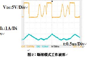 注意到圖1是基于連續電流模式下所得到的波形,對于非連續模式,由于開通前的電流為0,所以,除了Coss放電產生的功耗外,沒有開關的損耗,即非連續模式下開通損耗為0。但在實際的檢測中,非連續模式下仍然可以看到VGS有米勒平臺,這主要是由于Coss的放電電流產生的。Coss放電快,持續的時間短,這樣電流迅速降低,由于VGS和ID的受轉移特性的約束,所以當電流突然降低時,VGS也會降低,VGS波形前沿的米勒平臺處產生一個下降的凹坑,并伴隨著振蕩。