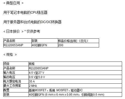 長期以來,瑞薩一直在提供符合DrMOS標準的一系列產品,尤其是輸出電壓為12V的服務器和臺式電腦。新的R2J20653ANP將可承載的輸入電壓擴展到適用于筆記本電腦的20V適配器電壓,成為瑞薩高電壓容限電源類的首款產品。這款產品的推出有助于筆記本用CPU電源在實現更加小型化的同時,達到更高的性能,并且有望帶動DrMOS標準更加廣泛的應用。
