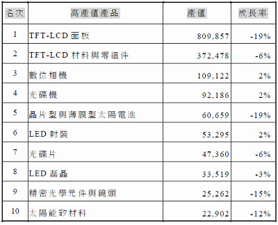 臺灣地區光電十大產品 (單位:百萬臺幣/%)