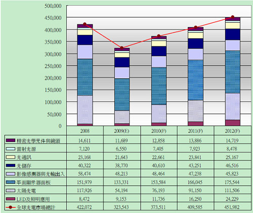 根據光電科技工業協進會(PIDA)的分析,2009年全球光電市場持續受到全球金融風暴的影響,又從2008年的4,220億美元,大幅衰退了23%,跌到3,235億美元,可謂創下有史以來最大的跌幅;更甚于1997年的亞洲金融風暴和2000年的通訊市場泡沫化。預期全球光電市場將會于2010年反彈,成長16%;亦高于以往的成長率,然后再以10%左右逐年回升。