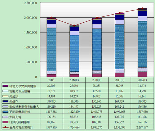 所幸景氣在2009年第一季跌到谷底之后便開始逐步回升,至第四季才確定恢復熱絡的景象。但是臺灣地區光電產業還是難抵金融風暴的余威,整體產值下滑了13%,到1兆7,247億新臺幣。如原本所預估的,金融風暴會犧牲掉兩年的成長率;保守預期臺灣地區光電產業將于2010年重拾成長,再度站回接近2兆新臺幣之規模。