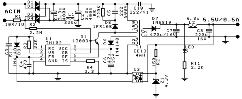 TH102零負載功耗包括:高壓啟動電阻(圖2、圖3中R2)靜態功耗,約30mW左右;開關功率管開關損耗;磁復位損耗,圖2、圖3采用RCD電路(圖中R5、C5、D5)損耗較大,若采用齊納二極管磁復位電路能降低損耗,但成本較高;開關變壓器開關損耗;TH102工作損耗;和輸出反饋損耗;按圖2、圖3方案,零負載功耗小于0.3W,圖中D8在零負載和小負載時將增大開關周期,減小開關功率管開關損耗。
