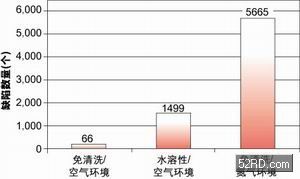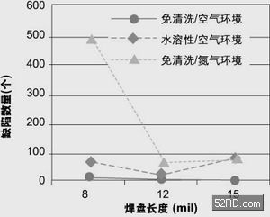 圖1顯示出三種不同組裝工藝的良品率情況。由圖可見,使用免清洗焊膏在空氣環(huán)境下進行回流焊產生的不良最少,總數為66個;使用水溶性焊膏在空氣環(huán)境下進行回流焊次之,不良有1,499個;使用免清洗型焊膏在充氮環(huán)境下進行回流焊產生的不良數最多,為5,665個。圖3還表明在充氮環(huán)境下以及焊膏助焊成分活性增大(水溶性焊膏)時,產生的不良數目會增多。