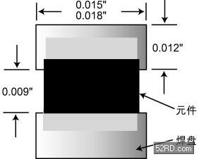 圖4給出批量進行0201元件回流焊時的元件焊盤設計建議。建議兩焊盤間距0.009英寸,焊盤長度0.012英寸,寬度在0.015英寸到0.018英寸之間,具體取決于助焊劑成分類型和焊膏回流焊環(huán)境。0.018英寸寬度適用于充氮焊接環(huán)境、氧氣含量很低(50ppm以下)以及焊劑活性很強或潤濕時間很短的情況;而0.015英寸寬度焊盤則適用于在空氣環(huán)境中進行回流焊接、焊膏溶劑活性較弱以及有較長的潤濕時間等情況。
