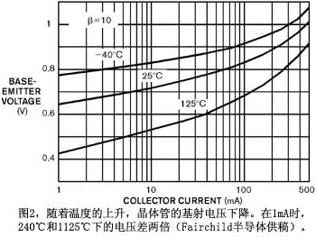熱與冷都會對電路造成負面影響。在極高溫下,芯片可能燒毀(圖1)。更常見的情況是,如果你的設計達到未曾預料的溫度,很多部件都可能超出規(guī)定極限。當出現(xiàn)這種情況時,電路就可能表現(xiàn)出難以預料的行為。另外一個情況也同樣值得關注,即電路溫度從熱到冷,然后又從冷到熱。這種狀況會造成熱沖擊,也會毀壞元件。很多工程師并不關心自己的電路在低溫下的性能,但這種忽視是一個錯誤。半導體器件的性能在低溫下會發(fā)生顯著變化。雙極晶體管的基射結電壓在低溫下會大大升高(圖2和參考文獻1)。AnalogDevices產(chǎn)品開發(fā)工程經(jīng)理FranciscoSantos說:“如果你要設計一個能夠在負溫度下工作于1.8V的放大器,就要考慮當從室溫降到-40℃時,VBE(基射電壓)會增加130mV。這種情況將迫使設計者采用一組完全不同的放大器架構。”