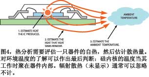 電路的熱分析分三個步驟。首先估計IC中產(chǎn)生的熱量。然后,估計電路板或散熱片散掉的熱量。最后,估計部件將要運行的環(huán)境溫度(圖4)。在估計元件產(chǎn)生的熱量時,DC分析通常沒什么價值。一只電壓為1V、流過1A電流的電阻器,會產(chǎn)生1W的熱量。但是,要估計交流或未確定的信號所產(chǎn)生的熱量就比較麻煩。首先,從電源端到接地腳的靜態(tài)電流總是在耗散一個直流功率。一個采用10V電源和5mA靜態(tài)