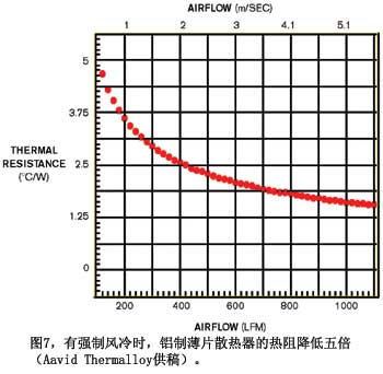 對流散熱也有一些困難。例如,氣流對商用散熱片的影響(圖7)。注意,在高溫下,熱阻會增加五倍。使用強制風冷的散熱片有較薄、間距更近的鰭片,比如一款風扇式CPU冷卻器。如果你的產(chǎn)品沒有風扇,則IC產(chǎn)生的熱量會傳導和散播出來,然后傳送到機內的空氣中。接下來,隨著整個機器溫度的上升,熱量通過對流傳送給周圍的空氣,如果你把機器放在腿上,則部分熱量也會傳導過來。外殼材料的熱阻就變得很重要。熱量從內向外的傳送速度,塑料殼要慢于金屬殼。