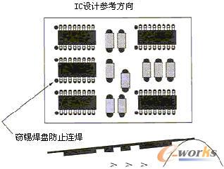 PCB上元器件的布局對生產(chǎn)效率和成本有相當(dāng)重要的影響,是衡量PCB設(shè)計的可裝聯(lián)性的重要指標(biāo)。一般來講,元器件盡可能均勻地、有規(guī)則地、整齊排列,并按相同方向、極性分布排列。有規(guī)則的排列方便檢查,有利于提高貼片/插件速度,均勻分布利于散熱和焊接工藝的優(yōu)化。另一方面,為簡化工藝流程,PCB設(shè)計者始終都要清楚,在PCB的任一面,只能采用回流焊接和波峰焊接中的一種群焊工藝。這點在組裝密度較大、PCB的焊接面必須分布較多貼片元器件時,尤其值得注意。設(shè)計者要考慮對焊接面上的貼裝元件使用何種群焊工藝,最為優(yōu)選的是使用貼片固化后的波峰焊工藝,可以同時對元件面上的穿孔器件的引腳進(jìn)行焊接;但波峰焊接貼片元件有相對嚴(yán)格的約束,只能焊接0603及以上尺寸的片式阻容﹑SOT﹑SOIC(引腳間距≥1mm且高度小于2.0mm)。分布在焊接面的元器件,引腳的方向宜垂直于波峰焊接時PCB的傳送方向,以保證元器件兩邊的焊端或引線同時被浸焊,相鄰元件間的排列次序和間距也應(yīng)滿足波峰焊接的要求以避免“遮蔽效應(yīng)”,如圖1。當(dāng)采用波峰焊接SOIC等多腳元件時,應(yīng)于錫流方向最后兩個(每邊各1)焊腳處設(shè)置竊錫焊盤,防止連焊。