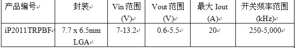 iP2010的輸入電壓范圍為7V至13.2V,輸出電壓范圍則為0.6V至5.5V,輸出電流高達30A。這個器件最高運行頻率為3MHz。在5MHz運行時,與iP2010引腳兼容的iP2011備有相同的輸入和輸出電壓范圍,但后者經過優化,從而使最高輸出電流高達20A。通過以通用占位面積提供多種電流額定值器件,IR提供的靈活性能夠滿足不同客戶對電流水平、性能和成本的要求。
