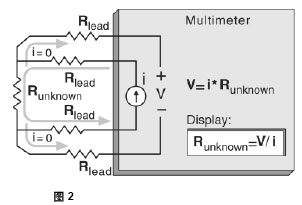 四線歐姆法是測量小電阻的最精確方法。用這種方法能自動扣除測試線電阻和接觸電阻。四線電阻測量連接見圖2。使用一個已知電流源和測量電阻器產生的電壓,就能計算出未知電阻值。一組附加測試線用來承載至未知電阻器的電流,在它上面產生的電壓可通過電壓感應線測量。沒有電流流過電壓感應線,因此它也不會產生電壓降。