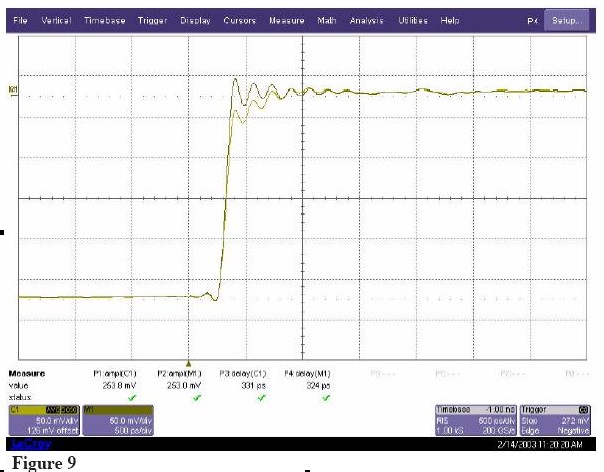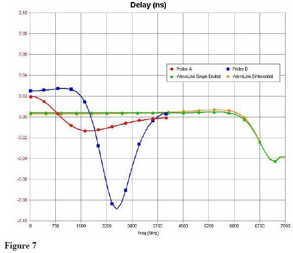 新的WaveLinks探頭不通過(guò)同一個(gè)測(cè)試信號(hào),測(cè)量結(jié)果如Figure 10 所示。由于探頭負(fù)載(<1%)信號(hào)幅度有輕微的減少,但主要的信號(hào)邊沿完全沒(méi)有失真。探頭阻抗產(chǎn)生的延遲是2ps,不會(huì)隨著信號(hào)頻率改變。