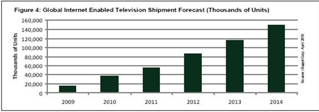 同樣,隨著品牌廠商努力延緩價格下跌速度和吸引消費者來更換其原有的老式平板電視,未來幾年對于IETV的推廣活動將會增強。iSuppli公司預測,2014年IETV市場將從2009年的1470萬臺增長到1.49億臺,復合年度增長率為58.9%。