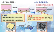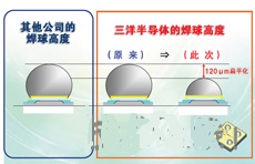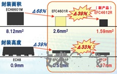 后者的封裝采用了兩項扁平化技術。一是改變了焊錫球的形狀。從原來的球狀改為了半球狀,高度降低了120μm。第二項是封裝背面的保護膜技術。將Si部分的高度比原產品降低80μm,并為確保強度而在背面粘貼了20μm的保護膜。這減少了60μm的高度。兩項技術加起來,此次將高度從已有的EFC4601R的550μm降低了33%至370μm。