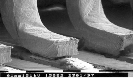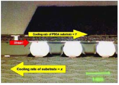線路板的升溫和降溫都帶來熱沖擊,熱沖擊的強度在無鉛焊接中尤為突出。無鉛波峰焊的波峰溫度一般為260度左右,比有鉛波峰焊高10-15度。線路板在焊接時整個板子的溫度經歷了從室溫到260度,再冷卻到室溫的過程,這個溫度變化的過程就帶來了熱沖擊。熱沖擊會使線路板上不同材質的物體因為熱脹冷縮系數不同而形成剪切應力。比如說BGA(見圖7),在承受熱沖擊時便會在焊球的頂部與底部形成剪切應力,剪切應力大到一定程度便會使BGA形成分層和微裂縫(見圖8)。這樣的缺陷很難檢測(即使借助X光機和AOI),而且焊點在物理連接上仍然導通(也無法通過功能測試檢測),但是當焊點受到外來影響時,便很容易形成開路。而選擇焊只是針對特定點的焊接,在點焊和拖焊時都不會對線路板整板造成熱沖擊,因此也不會在BGA等表面貼裝器件上形成明顯的剪切應力,從而避免了熱沖擊所帶來的各類線路板缺陷。