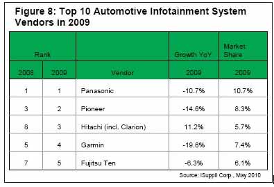 另一家日本一線供應(yīng)商日立2009年排名第三。該公司2008年排名第八,是2009年10大廠商中營(yíng)業(yè)收入增長(zhǎng)的兩家廠商之一。日立2007年與Clarion Co. Ltd.合并,合并營(yíng)業(yè)收入2009年占全球信息娛樂(lè)市場(chǎng)的5.7%。