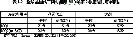 在IC制造業部分,預估2010Q2漸步入季節性需求上升期,配合產能逐步開出,臺灣IC制造業可望呈現價量齊揚的階段,帶動臺灣IC制造業產值上揚,預估可較2010Q1成長6.6%,并較去年同期成長47.6%