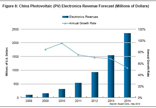 隨著政府補(bǔ)貼計(jì)劃在2010年達(dá)到頂點(diǎn),光伏電子市場也將同時觸頂。盡管預(yù)計(jì)接下來三年年增長率下降——除非出臺新的政策,但該市場將繼續(xù)保持一定的勢頭,足以在2014年實(shí)現(xiàn)24億美元的銷售收入。