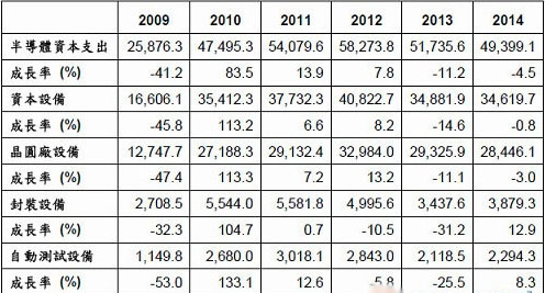 2009~2014年全球半導體資本設備支出預估(單位:百萬美元)
