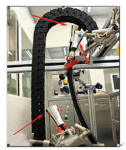 對于潔凈室環境來說,電纜拖鏈中的電纜集塵是一個復雜的問題。為了盡量減少集塵,需要盡可能地避免電纜以及套管之間的摩擦。盡管通過減少運動器件可以減少集塵,但是自動生產線上電纜的運動不可避免。另外,用于分隔圓形電纜和套管的分隔片和支架是產生集塵的另一個因素。如果不使用分隔片,或者分隔片沒有正確的安裝,電纜以及套管之間的摩擦將導致這些部件的蠕變、移動或扭曲,這樣就會增加集塵。
