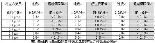 安裝圓形電纜的拖鏈A在不同運行速度都產生了不同數量的微粒(見表3)。按照VDIGuideline2083和ISO14644-1標準,鑒定這種電纜拖鏈/電纜裝置產生集塵的可能性是3%。