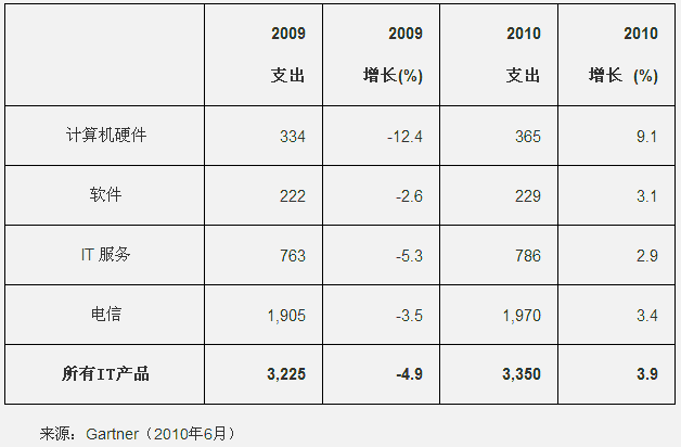 Gartner最新的研究報告指出,2010年全球IT支出預計將達3.35萬億美元,與2009年的3.22萬億美元的IT支出相比,增長為3.9%。不過,由于歐元對美元的貶值,Gartner已經調低了今年第一季度所做的2010年全球IT支出預計將增長5.3%的預測。
