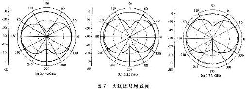 圖6示出了非均勻彎折線單極子天線的回波損耗曲線。從圖中可以看出,仿真結果與實際測試結果比較吻合。低頻段測得的阻抗帶寬(S1-1<-10dB)約為O.5GHz(2.2~2.7GHz);高頻段實際測得的阻抗帶寬(S11<-10dB)約為1.8GHz(4.48~6.28GHz)。圖7(a)~(c)分別示出了非均勻彎折線單極子天線在2.442GHz,5.25GHz和5.775GHz時的增益圖,增益分別為0.7dBi,1.65dBi和2.3dBi。