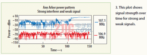 曾經在美國的底特律做過一個“難以再現”的極端動態范圍測試案例,可以用來評估收音機減輕很強相鄰干擾效應的能力。在這次測試行駛中,本地的3kW發射機工作在107.1MHz,用于干擾來自底特律的106.7MHz信號。在測試行駛期間,干擾源功率在5dBV至95dBV之間變化,而目標頻道功率在25dBV至50dBV之間變化。除了多徑衰落外,還有一個來自高大建筑物的陰影效應,它不時地妨礙直接視線接收。這種衰落很難用射頻信號發生器中的模型呈現,更適合記錄與回放信號仿真。