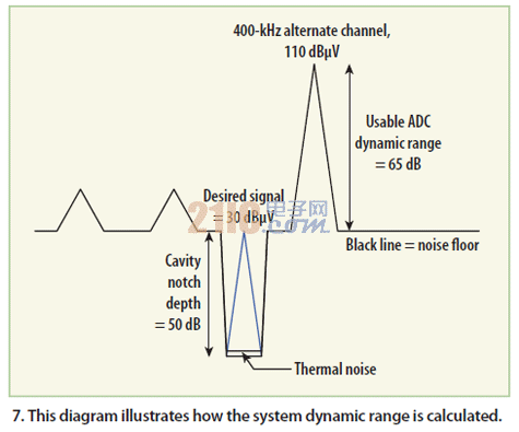 為方便案例分析,假設目標微弱信號的功率是30dBμV,強干擾源的功率是110dBμV,頻率與目標信號相距400kHz。這將是一個應用于FM收音機的最嚴格測試,也是在測試行駛的最差部分中遇到的典型情景(圖7)。在這些實驗條件設定好后,就可以計算系統的有效動態范圍。在現場ADC記錄動態范圍約65dB、FM腔體陷波濾波器約50db抑制能力下,這個測試系統在感興趣頻率點的動態范圍約為115dB。