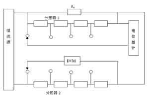 如圖2所示,圖中是本文提出的一種新的測(cè)量電阻負(fù)載系數(shù)的原理線路。它主要由直流恒流源、被測(cè)電阻Rx、精密分壓器、直流電位差計(jì)和7位半直流數(shù)字表(DVM)組成,其中分壓器1和Rx并連,其中分壓器1中的電阻1大于10Rx;分壓器2串連到電路中,其中分壓器中的電阻1小于0.1Rx。兩個(gè)分壓器各自由n個(gè)電阻組成。現(xiàn)取n=4扼要說明其工作原理。