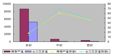 西部地區銷售產值和出口交貨值分別增長46.9%和48%,出口高出行業平均水平25.3和33.2個百分點。四川、重慶正逐步成為行業新的增長極,銷售產值分別增長45%和162.5%。