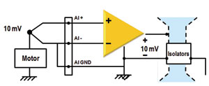 為了避免接地環路,需要選擇合適的接地模式,特別是在測量一個接地傳感器時,應該盡量避免使用單端輸入方式(RSE),這種方式會直接在數據采集設備與傳感器地間產生電流。如果使用的是差分方式(DIFF),由于電路為開路,因此電流被制止,從而較好地抑制了接地環路。當然,相比于差分,通過隔離技術(見圖5),可以在不讓兩個地相連,分隔數據采集設備地的同時,保持數據值的傳輸,從而從根本上解決了環路問題.