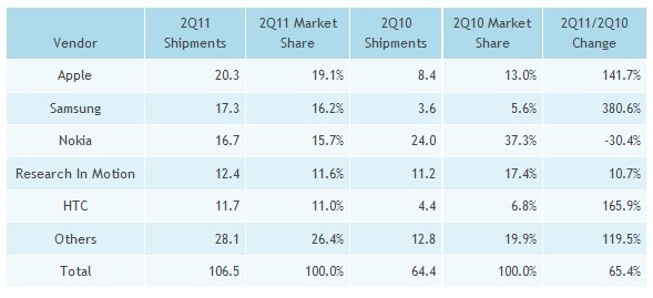 IDC最新市場報告指出,2011年第二季智能手機市場表現亮眼,出貨量從去年同期的6440萬支成長至1.065億支,成長了65.4%。而蘋果市占率達19.1,居市場首位,其后分別是三星、諾基亞、RIM與HTC宏達電。
