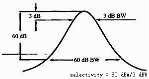 中頻濾波器的頻率選擇性是中頻濾波器的60 dB帶寬與3 dB帶寬之比,如圖3所示。它反映了頻譜儀分辨不等幅信號的能力,對于幅度相差60 dB的2個信號,其間隔至少是60 dB帶寬的一半,才可以分辨出2個信號,否則小信號可能被淹沒在大信號的裙邊中。用數(shù)字化技術實現(xiàn)的窄帶帶通濾波器頻率選擇性可達到5:1,模擬濾波器頻率選擇性可達到15:1或11:1。圖3為濾波器的頻率選擇性示意圖。