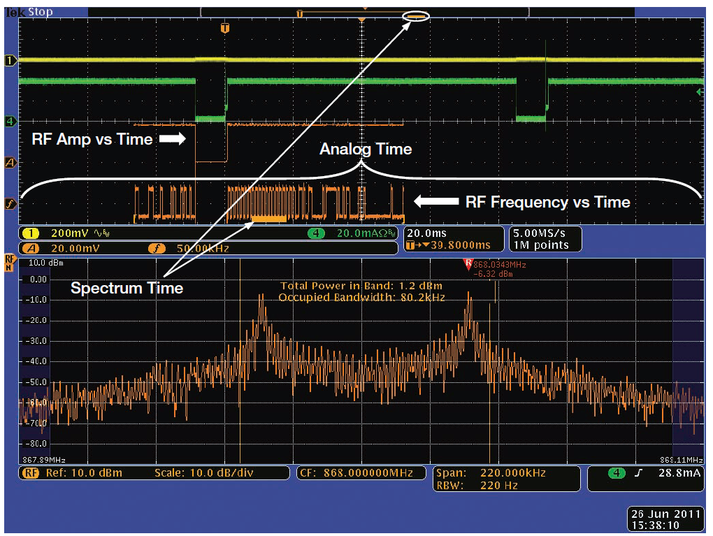 畫面的下半部分顯示了RF信號的頻域視圖,在本例中是無線電發射機輸出,畫面的上半部分是時域的傳統示波器視圖。頻域視圖中顯示的頻譜來自時域視圖中短橙色條指明的時間周期,稱為頻譜時間(Spectrum Time)。
