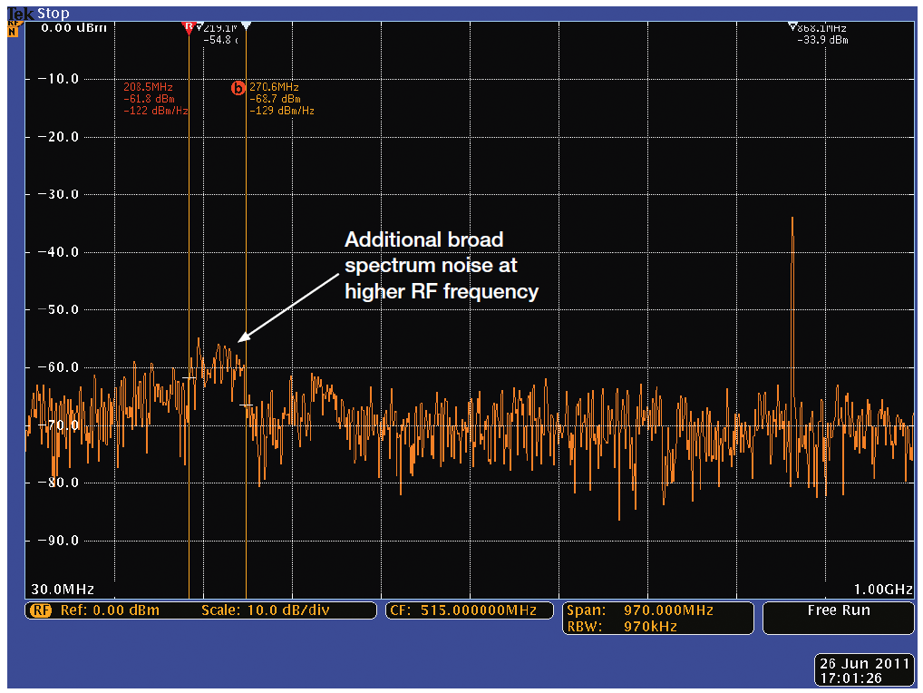 圖7. 在使用升壓轉換器時來自數字電路板的寬頻譜噪聲。