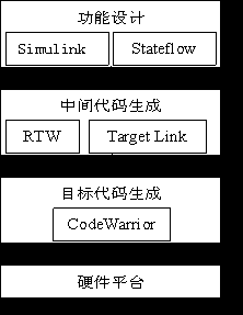 在進行向標(biāo)準(zhǔn) C代碼的轉(zhuǎn)換的過程中,可以根據(jù)需要加入符合OSEK規(guī)范的嵌入式實時操作系統(tǒng)。在代碼生產(chǎn)階段使用的主要工具是CodeWarrior。通過使用CodeWarrior提供的編譯器、調(diào)試器等工具,完成從標(biāo)準(zhǔn)C代碼向目標(biāo)硬件平臺上的產(chǎn)品代碼的轉(zhuǎn)換工作。下圖表示了汽車電子產(chǎn)品的代碼生成過程。