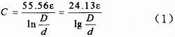 式中:C為電纜單位長度電容(pF/m);ε為絕緣介質(zhì)的相對介電常數(shù);D為電纜的外導體內(nèi)徑即絕緣層外徑(mm);d為電纜的內(nèi)導體外徑(mm)。