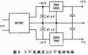采用DC/DC定電壓隔離非穩(wěn)壓模塊A0512S-2W,將5 V單電源變換成±12 V,再利用穩(wěn)壓模塊變換成±5 V電源,給前兩級(jí)放大器供電。電路如圖6所示。類似地,用定電壓隔離模塊A0515S-2W,將5 V變換至±15 V電源為末級(jí)放大器供電。如圖6所示。
