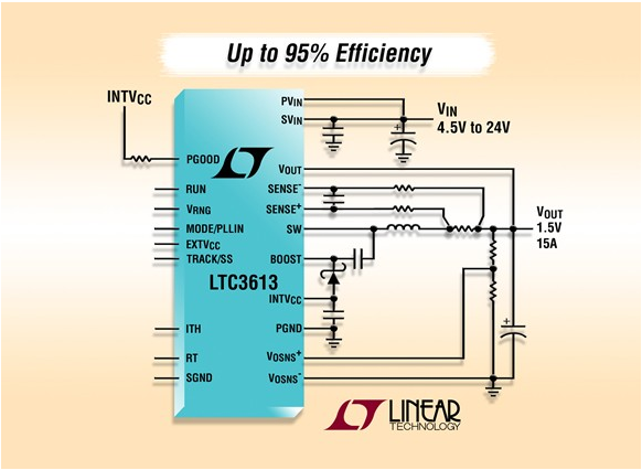 凌力爾特公司 (Linear Technology Corporation) 推出高頻、接通時間受控的同步降壓型 DC/DC 轉換器 LTC3613,該器件具差分輸出電壓采樣和時鐘同步。受控的接通時間和谷值電流模式架構在瞬態(tài)事件時可通過提高工作頻率以實現非常快速的瞬態(tài)響應,從而允許 LTC3613 僅在幾個時鐘周期內就可從大的負載步進中恢復。其 4.5V 至 24V 的輸入范圍支持多種應用,其中包括大多數中間總線電壓。集成的 N 溝道 MOSFET 可在 0.6V 至 5.5V 的輸出電壓范圍內提供高達 15A 的連續(xù)負載電流,從而使該器件非常適用于負載點應用。