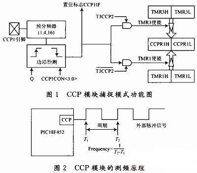 使用PIC18F452進行頻率測量的原理如圖2所示:設置CCP模塊工作于捕捉模式,并且讓它在每個上升沿捕捉一次數據,由相鄰兩個上升沿到來的時間差就可以得到被測脈沖的周期,從而也就得到了脈沖的頻率。