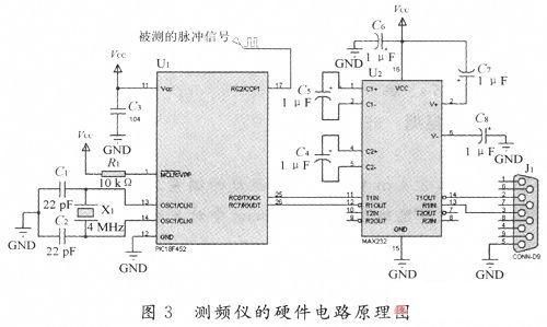 測頻儀的硬件電路主要包括兩個方面:頻率測量電路和數據通信電路。頻率測量是指使用PIC18F452的CCP模塊測量外部脈沖信號的頻率;數據通信是指將測量得到的數據通過串口傳至PC機進行處理。測頻儀的硬件電路如圖3所示。