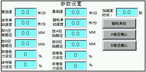 主畫面反映了全部傳動軸的運行狀態、當前放卷卷徑、線速度,以及各個擺桿的張力角度位置等,如圖3所示。參數設置界面提供了一些工藝參數數據等,如圖4所示。