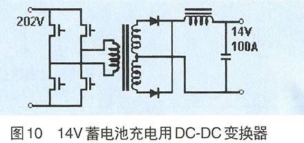 通常汽車中各種用電設備由14V蓄電池組供電(額定電壓為12V),Prius也選用了14V蓄電池組作為諸如控制計算機、車燈、制動器等車載電氣設備的供電電源,而對該蓄電池的充電工作則由直流220V通過DC—DC降壓變換器來完成的,變換器的電路圖如圖10所示。變換器的容量為 1.4kW(100A/14V),功率器件選用壓控型商用MOSFET(500V/20A),每個MOSFET芯片的面積為49mm2(7mm× 7mm)。