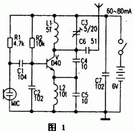 圖1是較為經(jīng)典的1.5km單管調(diào)頻發(fā)射機電路。電路中的關(guān)鍵元件是發(fā)射三極管,多采用D40,D5O,2N3866等。工作電流為60--80mA。但以上三極管難以購到,且價格較高,假貨較多。筆者選用其他三極管實驗,相對易購的三極管C2053和C1970是相當(dāng)不錯的,實際視距通信距離大于1.5km。筆者也曾將D40管換成普通三極管8050,工作電流有60--80mA,但發(fā)射距離達不到1.5km,若改換成9018等,工作電流更小,發(fā)射距離也更短,電路中除了發(fā)射三極管以外;線圈L1和電容C3的參數(shù)選擇較重要,若選擇不當(dāng)會不起振或工作頻率超出88--108MHz范圍。其中L1,L2可用0.31mm的漆包線在3.5mm左右的圓棒上單層平繞5匝及10匝,C3選用5-20pF的瓷介或滌綸可調(diào)電容。實際制作時,電容C5可省略,L2上也可換成10-100mH的普通電感線圈。若發(fā)射距離只要幾十米,那么可將電池電壓選擇為1.5-3V,并將D40管換成廉價的9018等,耗電會更少,也可參考《電子報》2000年第8期第五版(簡易遠(yuǎn)距離無線調(diào)頻傳聲器)一文后稍作改動。圖1介紹的單管發(fā)射機具有電路簡單,輸出功率大,制作容易的特點,但是不便接高頻電纜將射頻信號送至室外的發(fā)射天線,一般是將0.7--0.9m的拉桿天線直接連在C5上作發(fā)射的,由于多普勒效應(yīng),人在天線附近移動時,頻漂現(xiàn)象很嚴(yán)重,使本來收音正常的接收機聲音失真或無聲。若將本發(fā)射機作無線話筒使用,手捏天線時,頻漂有多嚴(yán)重就可想而知了。