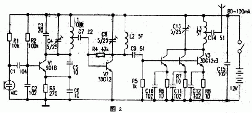 圖2為2km調(diào)頻發(fā)射機電路。本電路分為振蕩、倍頻、功率放大三級。電路中V1、C2--C6、R2、R3及L1組成電容三點式振蕩器,其振蕩頻率主要由C3、C4和L1的參數(shù)決定,其振蕩頻率為44~54MHz,該信號從L1的中心抽頭處輸出,再經(jīng)過C7耦合至V2放大,由C8和L2選出44~54MHz的二倍頻信號,即88-108MHz,,此信號由C9耦合至V3進行功率放大,V3由3只3DGl2三極管并聯(lián)組成,可擴大輸出功率。該電路正常工作時,電流約80-100mA。組成V3的三只3DG12可加上適當(dāng)?shù)纳崞苑肋^熱。制作時L1~L3用0.31mm漆包線在直徑3.5mm圓棒上單層平繞。