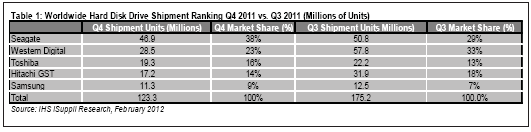 據IHS iSuppli公司的存儲市場簡報,2011年第四季度希捷重新奪回硬盤(HDD)出貨量的第一排名。此前七個季度西部數據一直保持第一,但去年的泰國洪災令其損失慘重。