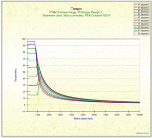 像上圖一樣的繪出一個電機的轉矩——轉速曲線并非輕而易舉之事,需要每個轉速下優化超前角來得到。MotorSolve可以快速設置多種轉速和超前角的組合方式,來繪制上述圖形。通過這些曲線的包絡線,能得到轉矩——轉速曲線和優化的超前角。恒功率變速內嵌磁鋼式永磁電機的曲線如上圖所示。