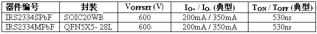 IRS2334SPbF 采用 SOIC20WB 封裝,而 IRS2334MPbF 則以 QFN5X5 封裝供貨,占位面積只有25 mm2 ,并按照合適的爬電與間隙距離要求來設計,確保產品堅固可靠,電壓可高達600V。